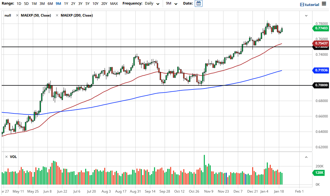 Looking at the chart, you can see that the 50 day EMA underneath probably offers a significant amount of support as it sits just above the 0.75 handle. This is a large, round, psychologically significant figure and you could also make an argument that the gold markets rallied during the trading session probably helped as well. With this being said, I think we continue to see this market as one that people will be buying dips on, as it has been in an uptrend for so long. You could make an argument for a slight bullish flag as well, and therefore I think all things being equal this is a market that has far too many technical reasons to go higher, right along with fundamental reasoning.