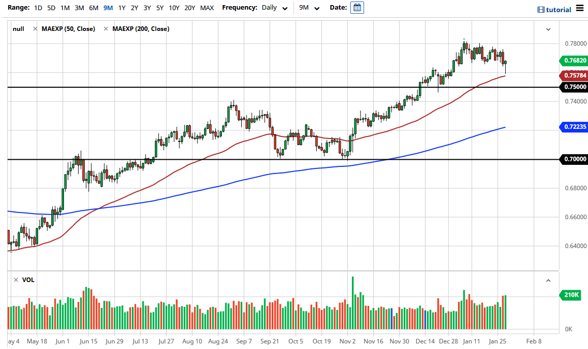 Because of this, I think that the market will continue to find plenty of buyers underneath, especially near the 50 day EMA and even if we broke down, I think we be looking at the 0.75 level underneath. The selling of the Australian dollar seems to be a bit of a stretch at this point, especially after the action that we have seen on Thursday. I do believe that eventually we go looking towards the 0.80 level, but it is going to be very noisy on the way up. I think that if you are looking at short-term charts and taking advantage of dips, you should do quite well in this pair. Ultimately, I have no interest whatsoever in trying to short this market, at least not until we break significantly below the 0.75 handle. If that were to happen, then we could be looking at the market pulling back significantly to go looking towards the 200 day EMA. However, until that happens, I just believe that buying the dips continues to work.