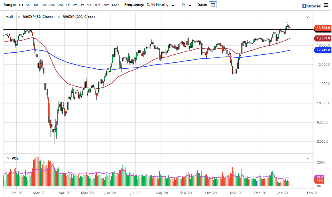 The DAX Index initially fell during trading on Tuesday as we crashed into the 13,825 level. This is an area that has been important in the past, as it was significant resistance and now should offer support. Luckily, the market has done exactly that and bounced from that area. This is a market that will find a lot of buyers on the dips, due to the fact that there has been a lot of stimulus thrown around out there, which favors exports in general. The DAX is laden with large exporters, so it follows that it will do quite well in this environment. After all, the “reflation trade” favors a lot of industrial components such as the blue-chip stocks that we see in the DAX.