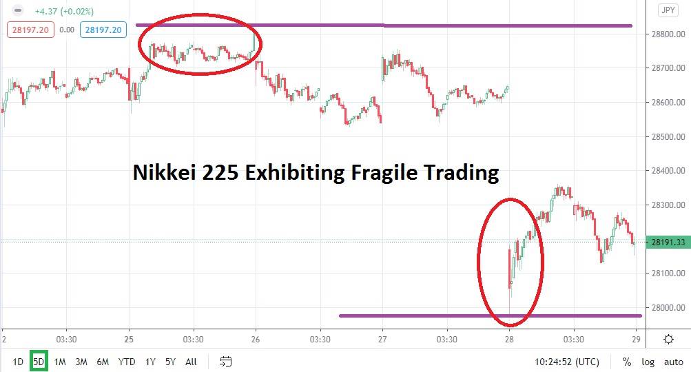 The Nikkei 225 opened trading today with a gap lower and then exhibited an inability to substantially produce a gain after the decline. The Nikkei 225 is near 28190.00 which still are within sight of highs made around the 14th of January. Yes, highs of 28980.00 made at the end of the second week in January may look far away, but the Nikkei has the capability to move fast and make up ground quickly.