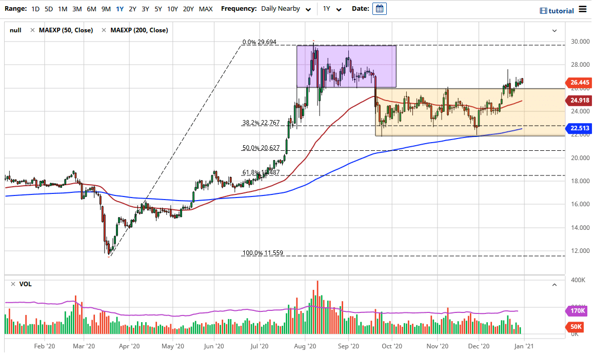 The $28 level above is significant resistance, and I think that it is only a matter of time before we tried to challenge to that level. The $28 level opens up the possibility of a move to the $30 level, so it is only a matter of time before we go to the upside and grind away. That suggests that we will probably have a lot of choppy behavior ahead of us, as the markets have a lot of work to do. Underneath, the 50-day EMA offers support as it is sitting just below the $25 level and is also tilting higher. There is a lot of noise in this market, and silver does tend to be very volatile, to say the least.
