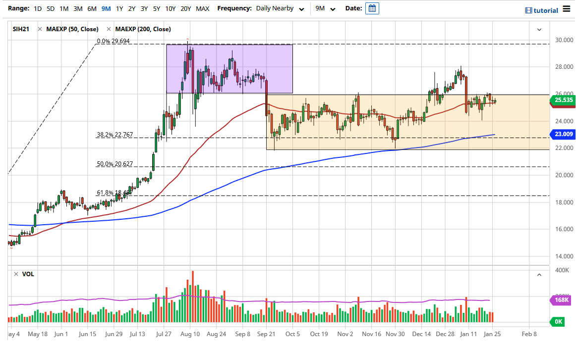 The 50-day EMA is a technical indicator that a lot of people follow, so that in and of itself is probably worth paying attention to, as it has been relatively reliable in the past. I do believe that eventually we will break much higher, but the question for me at this point is whether or not we need to pull back between now and then. If we did, then I anticipate that the $23 level, which currently features the 200-day EMA, could be a potential buying opportunity if we did break below $24. Regardless, I do not have a scenario in which I would sell silver right now; it has far too much cyclical value in what should in theory be an inflationary timeframe over the next year or two. Furthermore, you can make an argument for more industrial demand coming down the road if stimulus does in fact become the main focus of the Biden administration, which certainly looks to be the case.