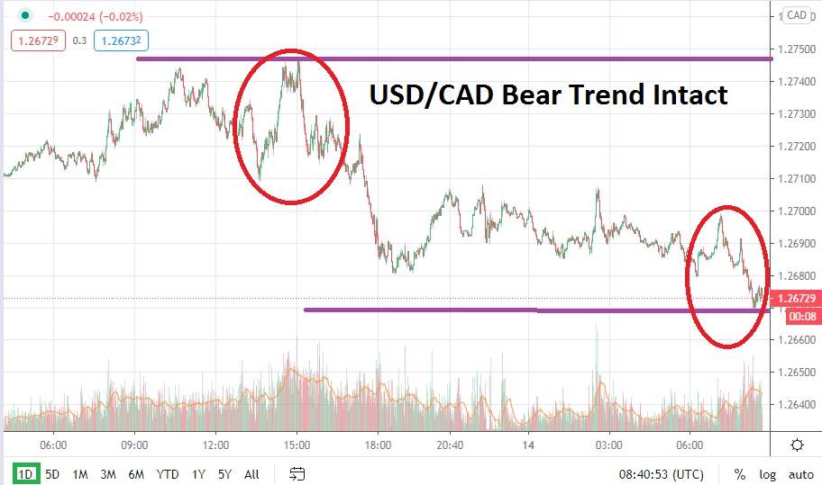 Technical resistance may face some short-term tests, but traders may be enticed to apply the notion that the 1.27000 mark could prove a durable stop loss juncture. If the USD/CAD is able to sustain its current price range and show short term that it doesn’t have enough firepower to create a long-lasting battle on higher values within the 1.269600 to 1.27030 range, speculators may continue to remain confident in the trend and the potential for it to create further downside capability.