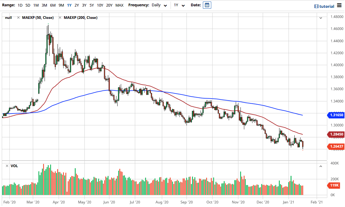 The market clearly has a significant amount of resistance above, especially near the 50 day EMA which is right around the 1.2850 level. That is significant technical barrier that a lot of people will be paying attention to, and therefore I think that if we broke above there the market would go looking towards 1.30 level. However, that would probably coincide more with increasing interest rates in the United States, and perhaps even crude oil dropping a bit. Yes, there is a massive amount of stimulus coming out of the United States, but we have seen more than our fair share of stimulus over the last several years, and ultimately it did not seem to drive up the demand for crude oil and other commodities. Yes, it is a short-term reflexive type of action, but at the end of the day demand for crude oil was falling long before the pandemic got here.