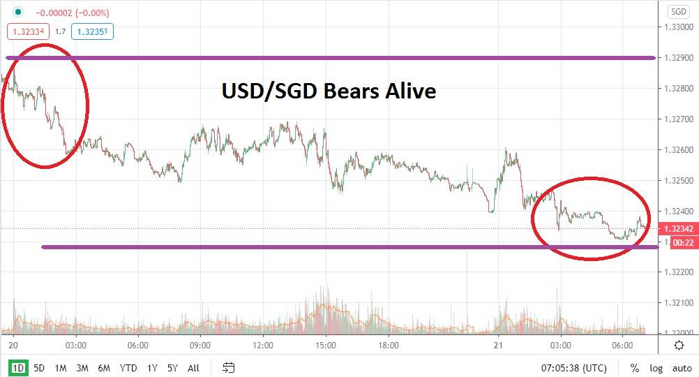 After hitting a high of nearly 1.33330 early this week, the USD/SGD has proven capable of shaking off its reversal higher and reigniting bearish sentiment. Current values are near key short-term support levels and, if they are broken lower, speculative wagers seeking more downside action may prove attractive. The 1.32300 mark could prove crucial today, and if it is punctured lower and values are sustained beneath this vicinity, the support level of 1.32250 should be watched intently.