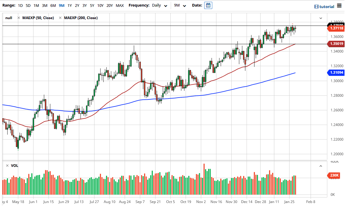 The British pound fluctuated during the trading session on Friday again as we continue to see the markets show extreme volatility. The 1.3750 level continues to be massive resistance, but I think the fact that we continue to bang up against it suggests that we are going to eventually break out. When we do, it could be a pretty violent move to the upside. I would anticipate at that point that the market would go looking towards the 1.40 level, which is the next large, round, psychologically significant figure and an area that has been important more than once.