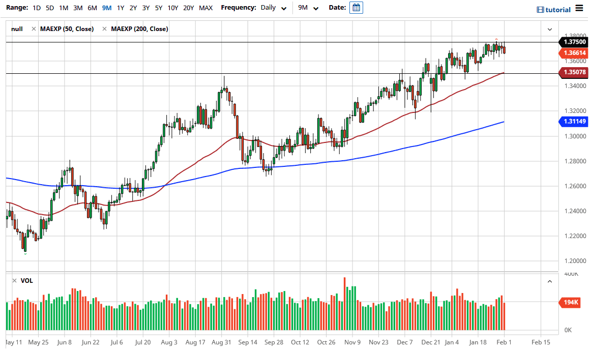 There are a lot of concerns when it comes to the British pound and the British economy. However, one of the things that has been driving the British pound higher is that the vaccines have been distributed quite quickly in the United Kingdom. Although we are in the midst of lockdowns, the reality is that the COVID-19 virus is starting to abate a bit, and even though there was a different strand of coronavirus in the United Kingdom, it has turned out to be less drastic and dangerous than people had thought. At this point, I think the market is trying to build up a bit of momentum to finally break above the 1.3750 level. If we can, then the market is likely to go looking towards 1.40 level. Longer term, the market is likely to continue to see a lot of noisy and choppy behavior, but the British pound is going to try to get back to historical norms. At this point, I believe that waiting for some type of bounce after a pullback is what most traders are going to be interested in.