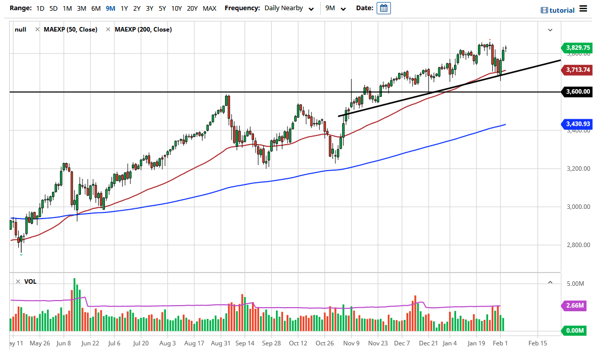 To the upside, if we can break above the 3860 handle, it is likely that we will see the market reaching towards the 3900 level, possibly even the 4000 level. The 4000 level has been my target for some time, and I do think that eventually we will get there. This means that we will probably have a lot of fluctuation on the way up, as long as we can stay above that uptrend line. Even if we break below the uptrend line, then I believe that the 3600 will offer support as well. I do not have any interest in shorting this market, because everybody knows that the S&P 500 is really just seven stocks pushing it more than anything else. We have plenty of liquidity out there to continue to push money into the same handful of stocks, and we have the “groupthink” on Wall Street that continues to throw money in the same companies. The market is likely to continue to see a “buy on the dips” scenario, as there continue to be massive amounts of liquidity thrown out there that Wall Street is trying to absorb by purchasing assets such as stocks. In general, I have no interest in shorting this market, and I believe that no matter what happens next, we will eventually find our way towards the 4000 level. Dips continue to present value from a longer-term standpoint, and therefore we will continue to see more of the same behavior.