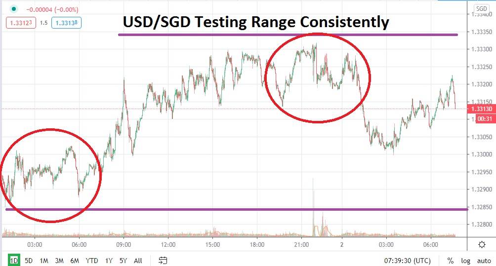The potential of the USD/SGD and its recent demonstration of testing resistance via its one-month chart offer speculators the opportunity to wager on reversals lower, which will test support that may be considered vulnerable. The past five days of trading have shown a capability to challenge lows, and traders who use solid limit orders via take profits have a chance to take advantage of what appears to be a short-term tendency of the USD/SGD to traverse its new higher range while showing some determination to move lower again.