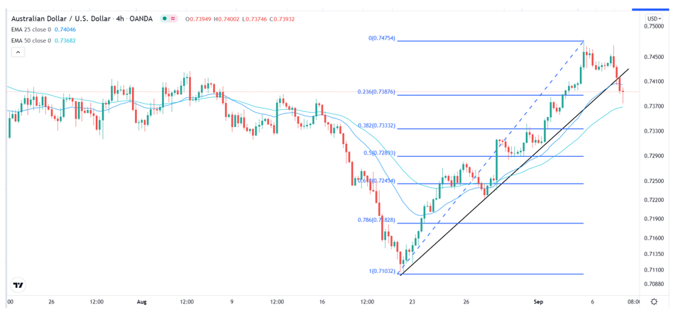 The four-hour chart shows that the AUD/USD pair formed a double-top pattern at 0.7477 on Tuesday. It then declined and moved below the ascending black trendline.