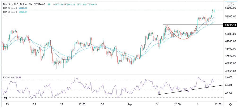 The hourly chart shows that the BTC/USD has been in a strong bullish trend in the past few days. This trend has seen the pair rise to a multi-month high of 52,760. Along the way, the pair has moved above the short and longer-term moving averages.