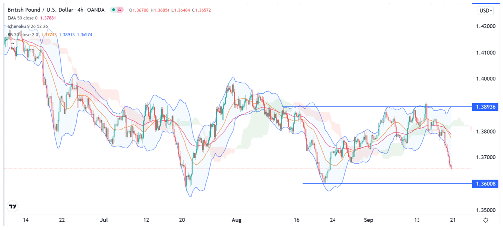 Also, it has moved to the lower line of the Bollinger Bands and below the Ichimoku cloud. Oscillators like the MACD and Relative Strength Index (RSI) have also been on a downward trend. Therefore, the path of least resistance is to the downside, with the next key level to watch being at 1.3600.