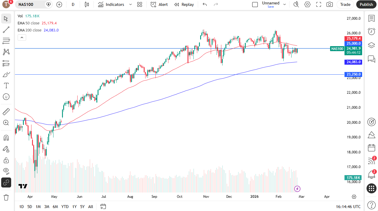 Keep in mind that the NASDAQ 100 will be dealing with earnings season and Nvidia is coming, so that's a big one. I think you've got a situation where it's probably easier to go higher than lower here once we get some type of external factor. If we can clear that 50-day EMA, then I fully anticipate that the NASDAQ 100 is probably likely to go to 26,000, maybe even 26,250 where we had seen the most recent pullback.