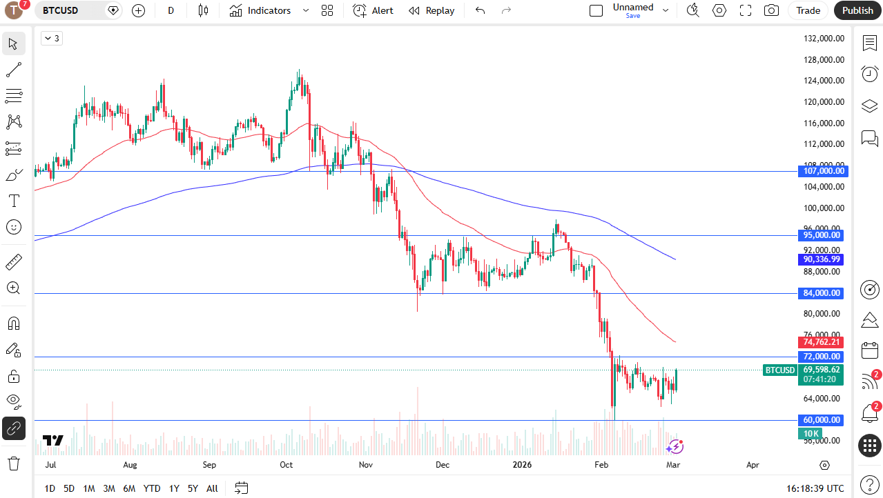 The next level I’m watching is the $72,000 level, and if we can break above there, then the market is likely to go even higher, perhaps testing the 50-day EMA and then the $84,000 level. Ultimately, this is a market that I think continues to be very noisy, and if you are a longer-term believer, you probably already starting to buy the dip.