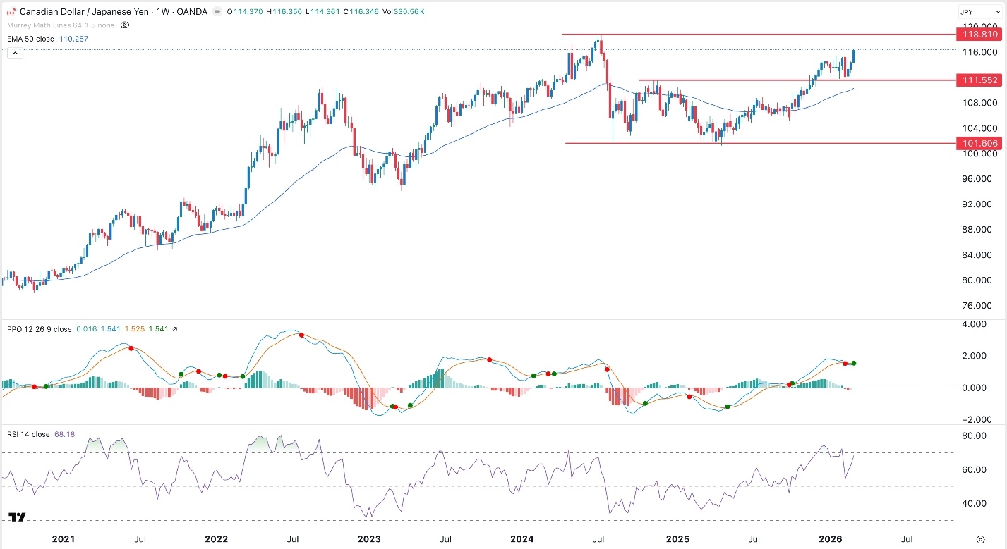 The CAD/JPY exchange rate continued rising, reaching its highest level since July 2024 as the war in Iran exposed Japan to a major oil shock. It jumped to a high of 116.35, up sharply from last year's low of 101.17.