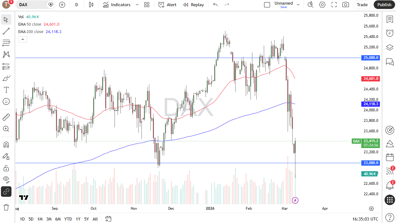 The German DAX fell initially on Monday as there was a lot of fear due to the fact that we are seeing the conflict in the Middle East escalate a bit. That being said, the market has fallen pretty significantly to break down below that 23,000-euro level that had been such reliable support. What I found interesting is that later in the session, we saw a lot of buyers jumping into the market to show signs of life.