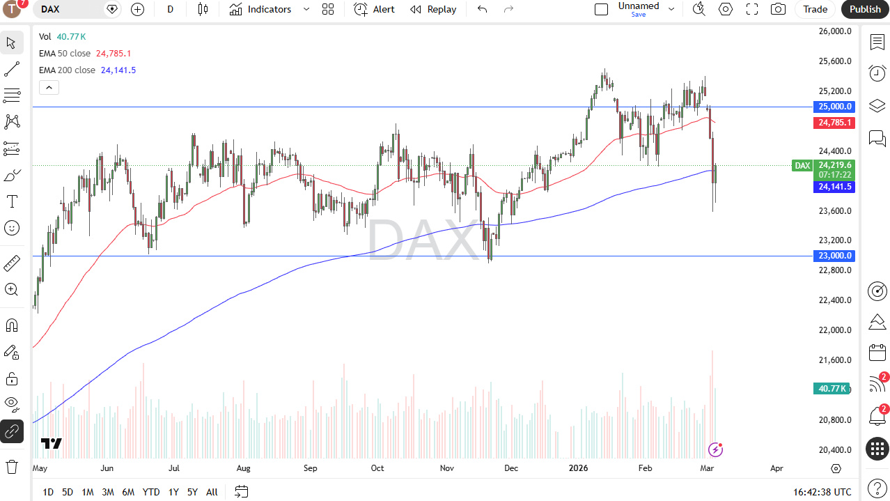 The German index fell Wednesday to start things off, but then turned around to show signs of life near the 200-day EMA.