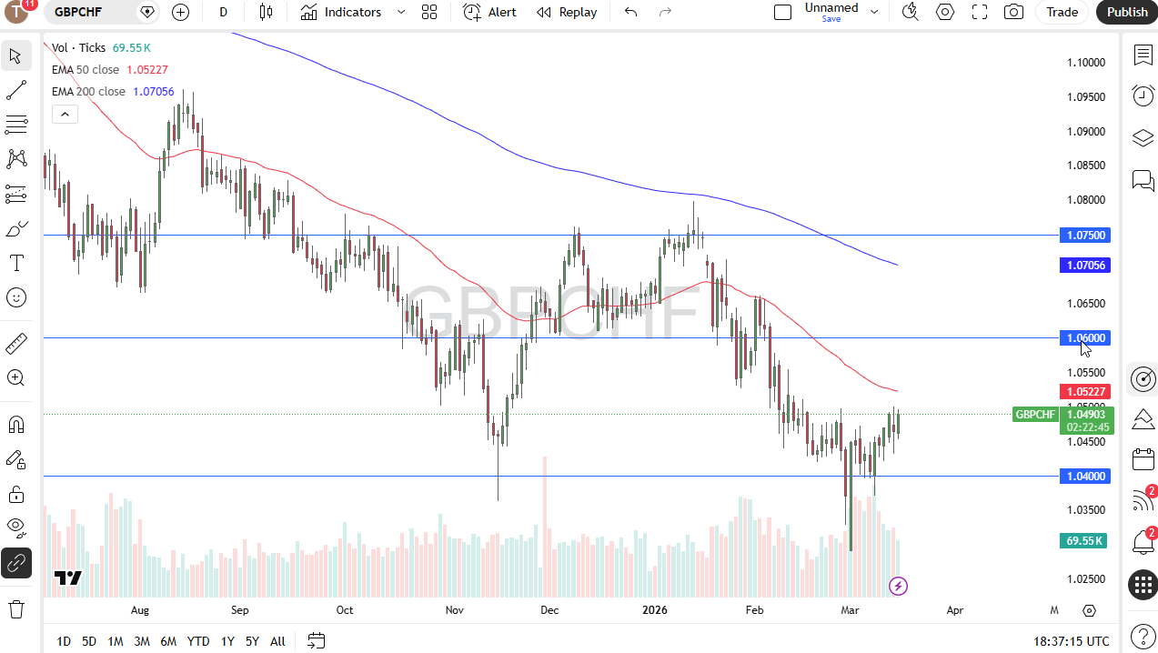 The daily trend is bullish over the last couple of weeks as the market has seen consistent gains over the last week or so. The recent shock of the war in Iran initially caused a spike in safe haven demand for the Swiss franc, but it seems like the pound continues to show its surprising resilience. I do believe that we need to break above the 1.0536 level, which is a recent high from March 14, to really get things moving to the upside. I see support at 1.0455 underneath and then again at the 1.04 level.