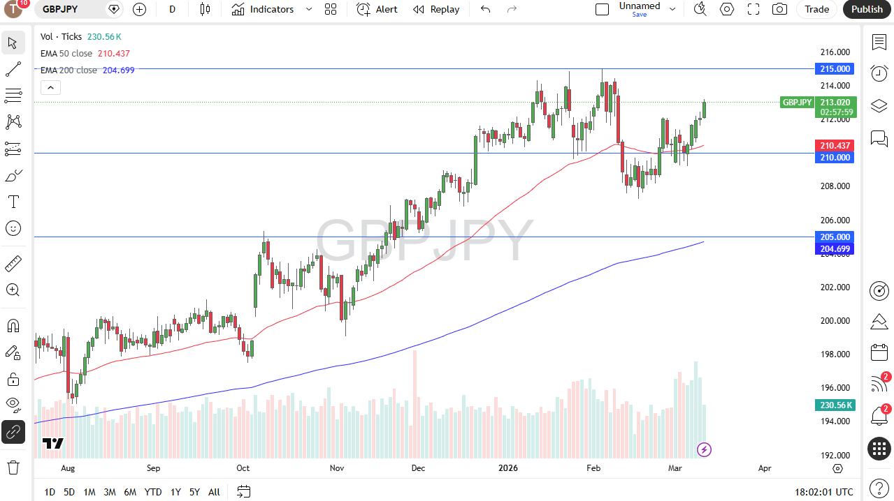 This is Christopher Lewis taking a look at the British Pound against the Japanese Yen. The British Pound has rallied quite nicely during the trading session here on Wednesday as we have broken to the upside and it now looks very much like a market that is going to do everything it can to reach the 215 Yen level.