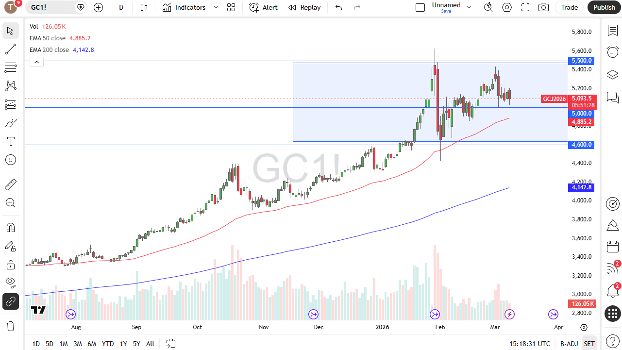 If we can break above the $5,200 level, then it allows the market to go looking to the $5,400 level. I have no interest in shorting gold, but it is interesting that we have seen a lot of noisy behavior and a lot of erratic behavior but there is so much risk destruction out there that it does make a certain amount of sense that gold will continue to have a bit of a bid.