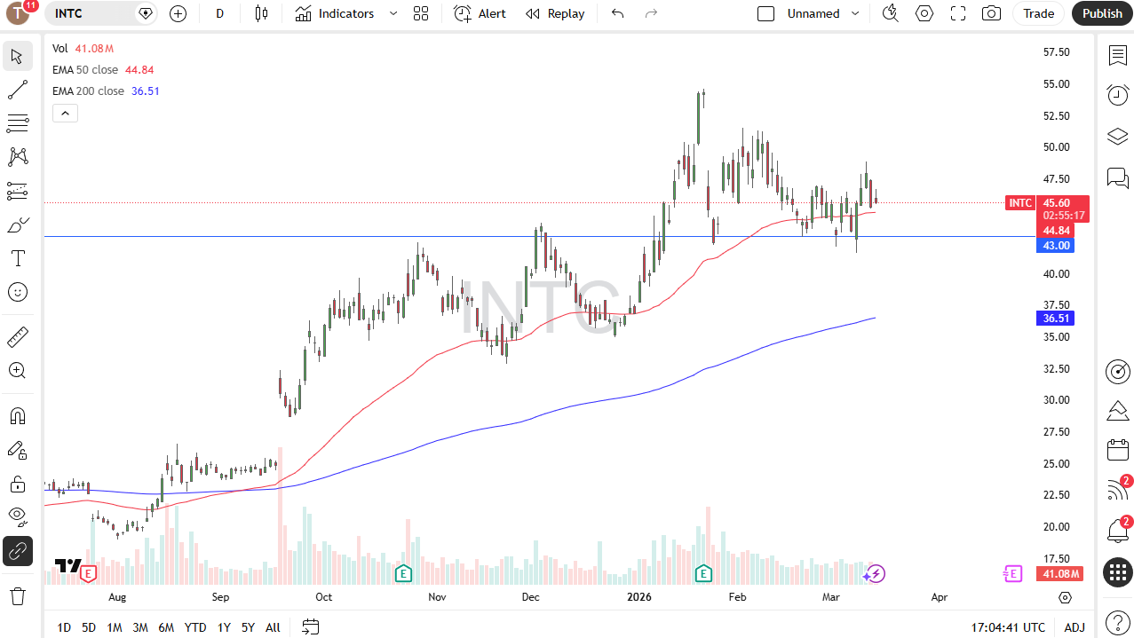 That being said, Intel itself is currently in high stake in show me type of phase in the marketplace. After having a massive recovery throughout most of 2025, the stock is starting to show signs of consolidation right around the $45 area as of the last couple of weeks.