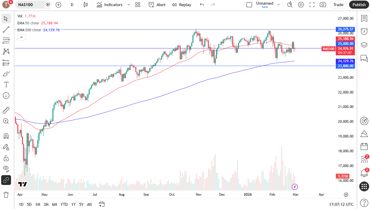 The NASDAQ 100 has been fairly negative during the early part of the trading session on Friday but is starting to try to come back around. I think, ultimately, this is a market where we are focusing on the idea of whether or not we can break above the 25,000 level. If we can get above the 25,000 level, it opens up the possibility of a move to much higher levels. If we get that, then I think we're probably looking at 25,400 followed by the 26,275 level. Somewhere under current levels, buyers will more likely than not show up again.