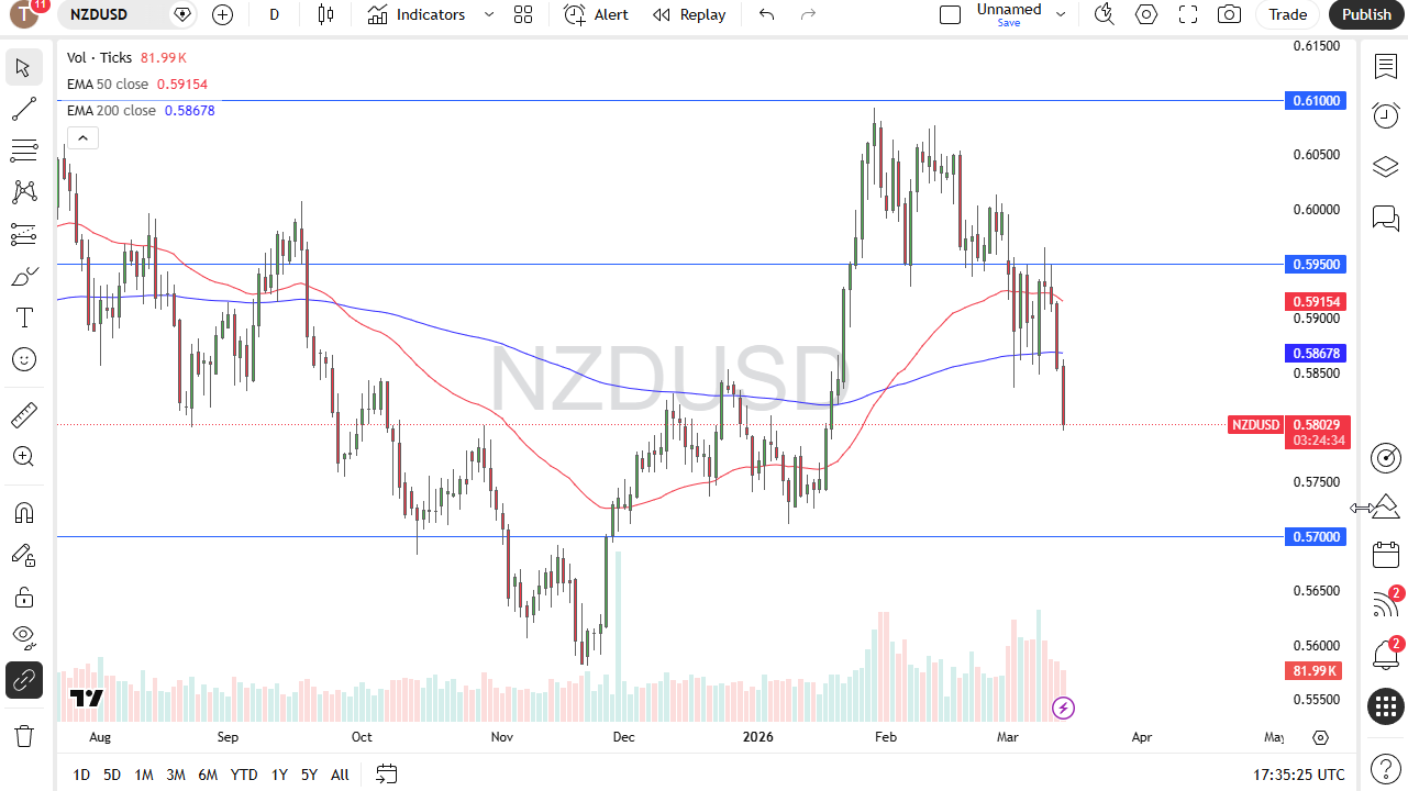 I do think that ultimately, we will drop a bit further, maybe down to the 0.5750 level, maybe 0.57. And at that point in time, we may see a bit of an attempt to turn things around, but in the short term, this looks like a market that's got nowhere to go but lower. Rallies, I believe, offer selling opportunities, especially after the last 2 days, which have been absolutely brutal on the kiwi dollar. This is a market that you're looking for value in the US dollar, not the New Zealand dollar, so therefore you fade signs of exhaustion after short-term bounces.