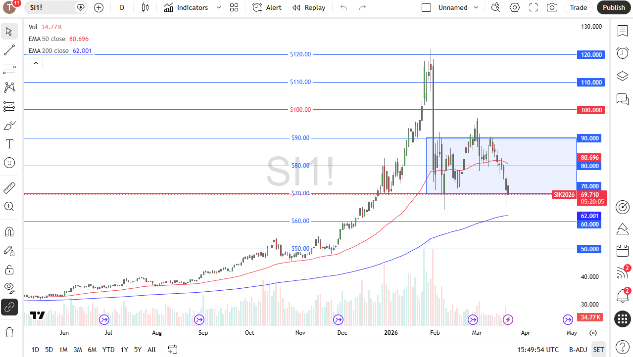 To the upside, if we do rally, we will have to recapture the $75 level to build any type of confidence and even then, you are probably looking at sideways action more than anything else. The 50-day EMA sits just above $80, and I think that will be a major factor as well. Ultimately, you also have to keep in mind that traders continue to look at silver through the prism of a risk appetite situation with silver not necessarily being a risk appetite metal. The overall attitude of this market was based on industrial demand when we shot straight up in the air. Now there are serious questions about AI data centers and whether or not the math works out. With all of that and the fact that the US dollar is gaining with higher rates, it is difficult to get overly excited about silver and if we break down this could get rather ugly.