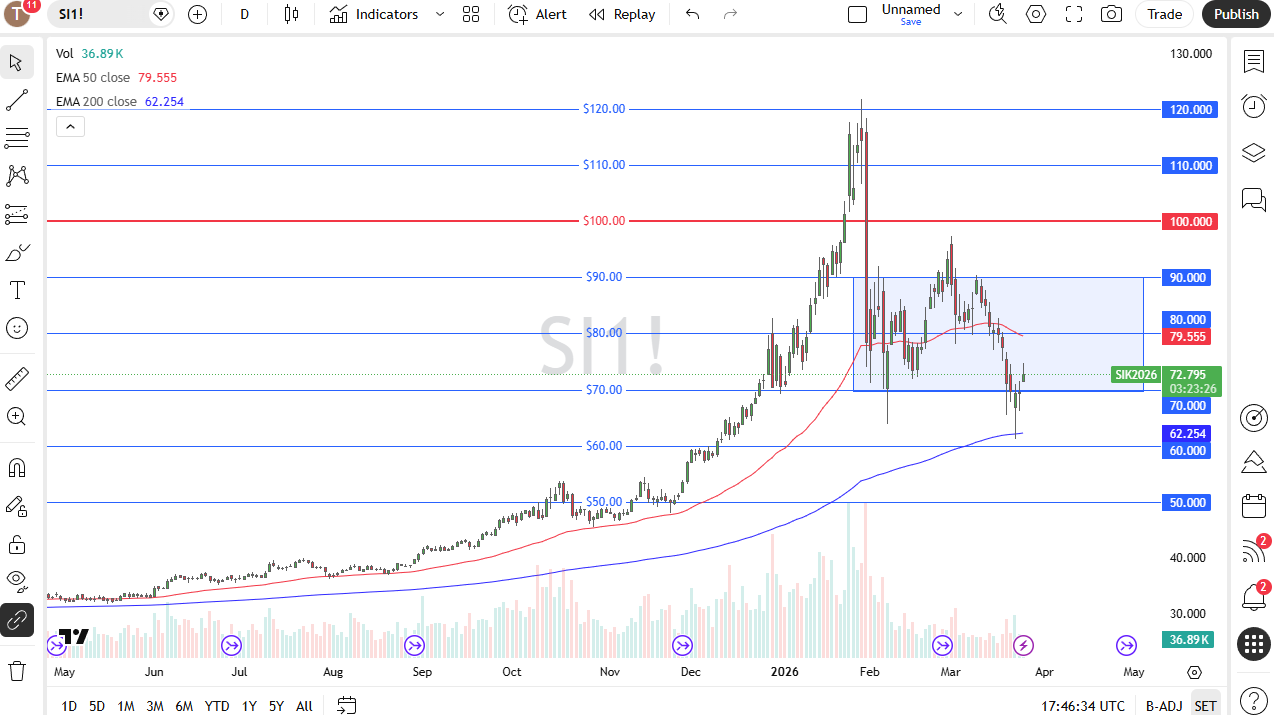 The silver market, breaking above the $70 level, was a bullish sign. The question now is whether or not we can hold because if we break down below there then it is possible that we may crash back towards the 200-day EMA. In that environment you are looking very much like a market that is perhaps determining whether or not the 200-day EMA can continue. I think ultimately the 200-day EMA can continue to offer support unless something truly bad happens.