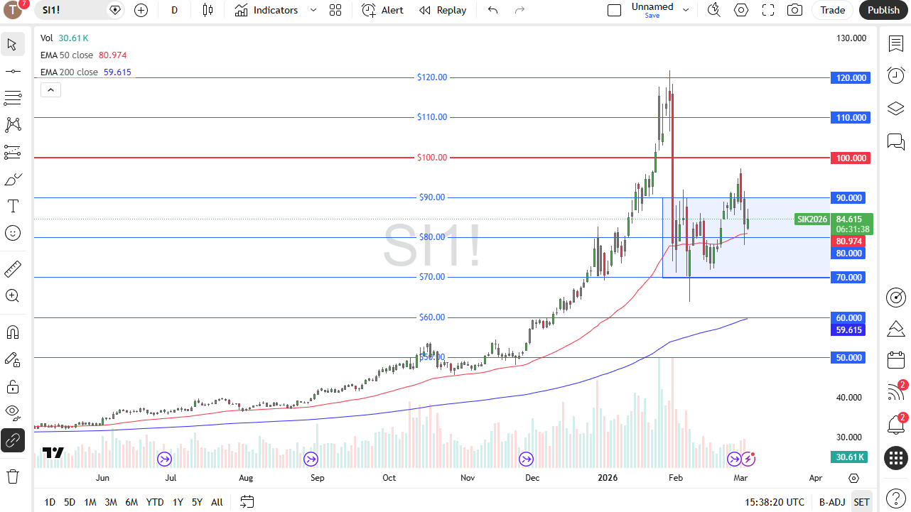 The market breaking below the $80 level opens up the possibility of a move to the $70 level which is the bottom of the recent consolidation. If we were to break down below there, then I think silver falls apart and really starts to drop significantly. On the other hand, if we break above the $90 level then we could test the highs again.