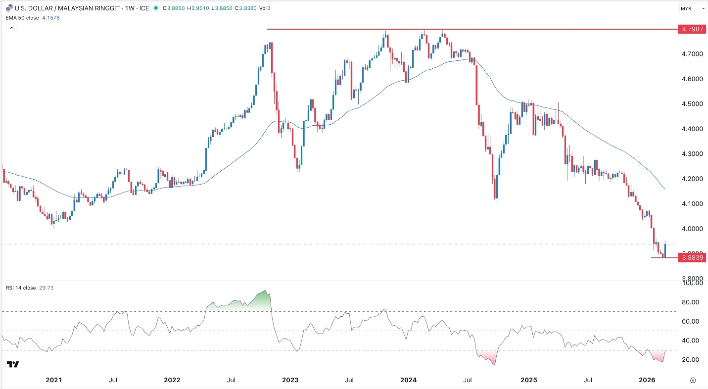 The weekly timeframe chart shows that the USD/MYR exchange rate has slumped in the past few years, moving from a high of 4.7987 in 2p24 to the current 3.9380. This retreat started when it formed a triple-top pattern, a common bearish reversal sign in technical analysis.