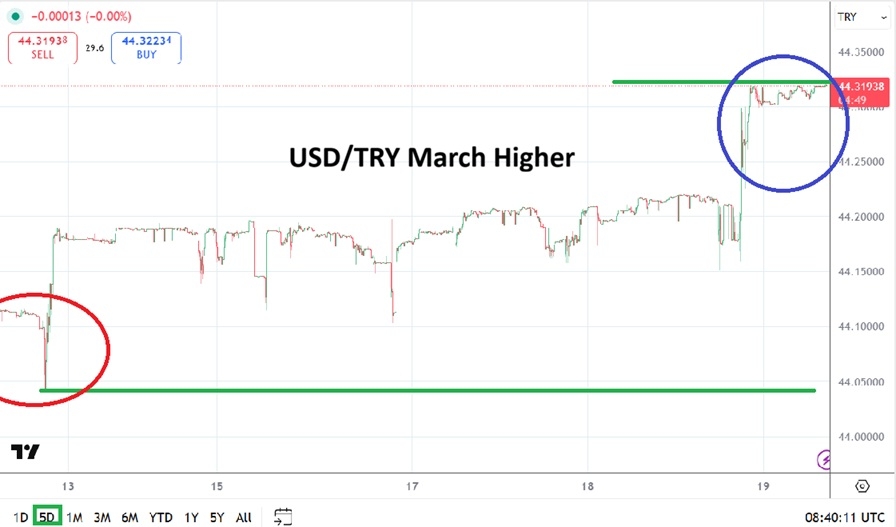 The USD/TRY moved from the 44.17100 vicinity up to within sight of 44.32000 rather quickly yesterday. The currency pair has sustained its higher values early this morning. Again, it is important not to attach false narratives to the move upwards in recent weeks.