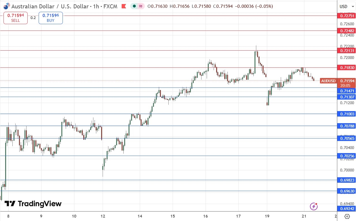 Go long following a bullish price action reversal on the 1H1 time frame H1H1H1 time frame immediately upon the next touch of $0.7147, $0.7130, or $0.7100.