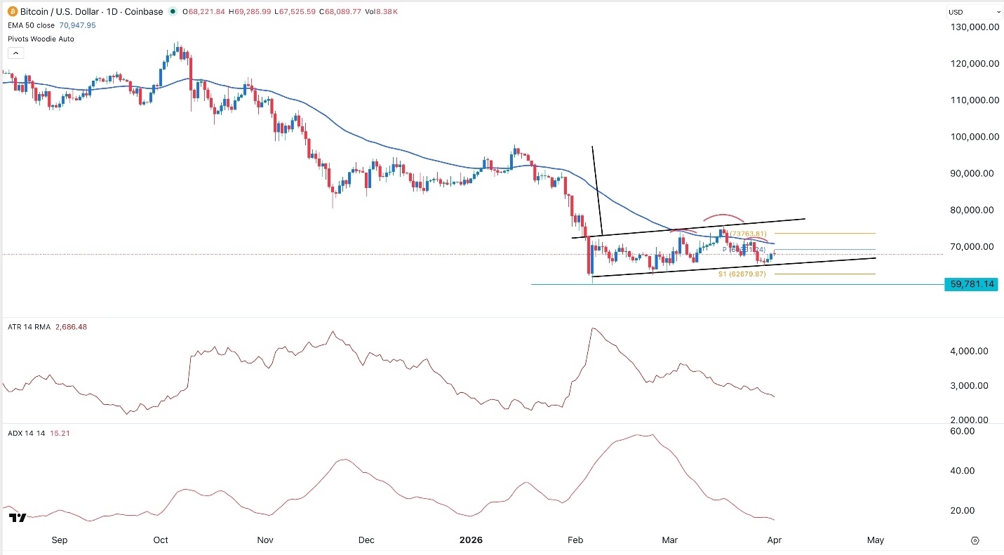 The daily timeframe chart shows that the BTC/USD pair has remained in a narrow range since the first week of February this year. As a result, the Average True Range (ATR) and the Average Directional Index (ADX) have continued falling this month.