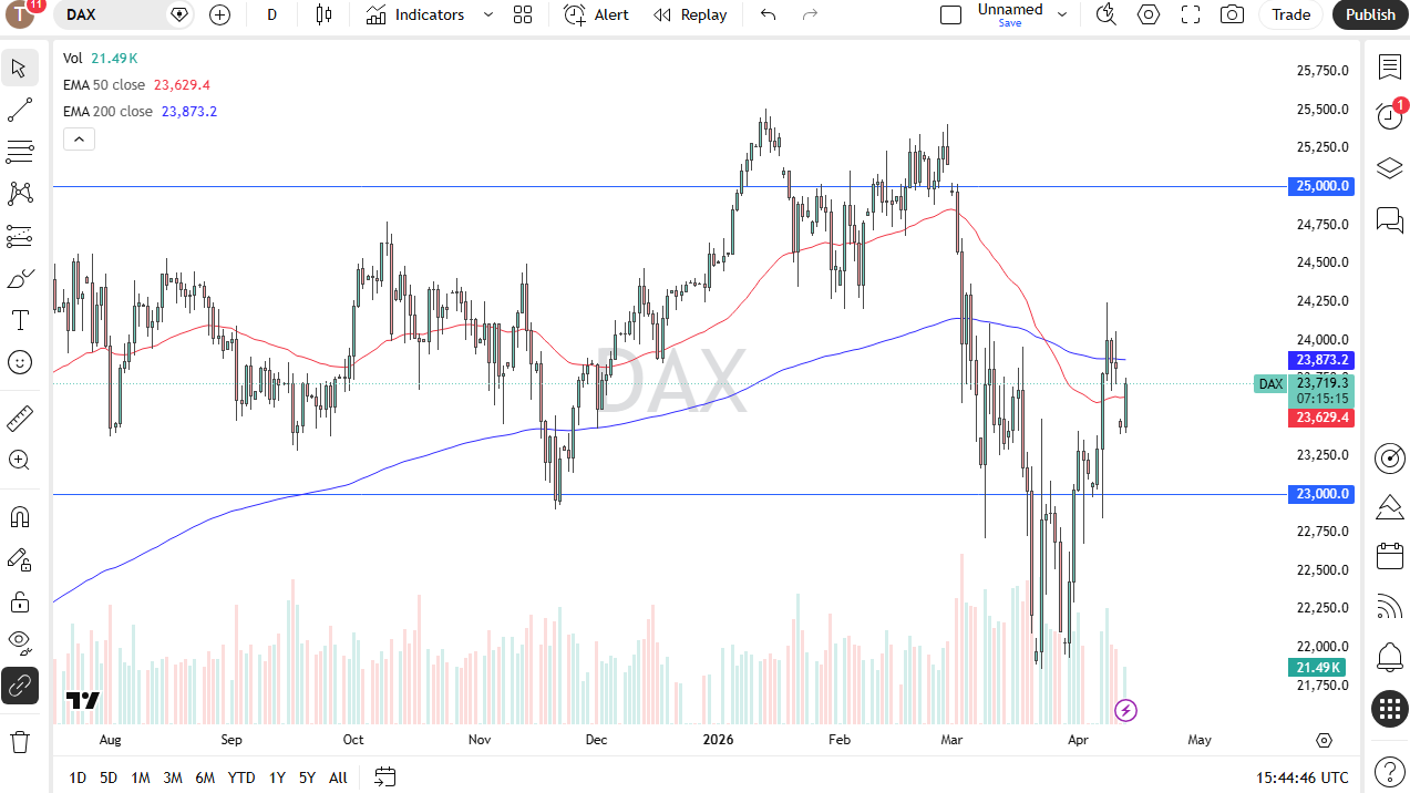 The DAX in Germany initially gapped lower at the open due mainly in part to the idea that the United States and Iran could not come together with some type of settlement during peace talks. That being said, Germany's particularly vulnerable to a lot of things right now and with that being said you have to keep in mind that Germany will be held somewhat hostage by the Strait of Hormuz and what's going on there.