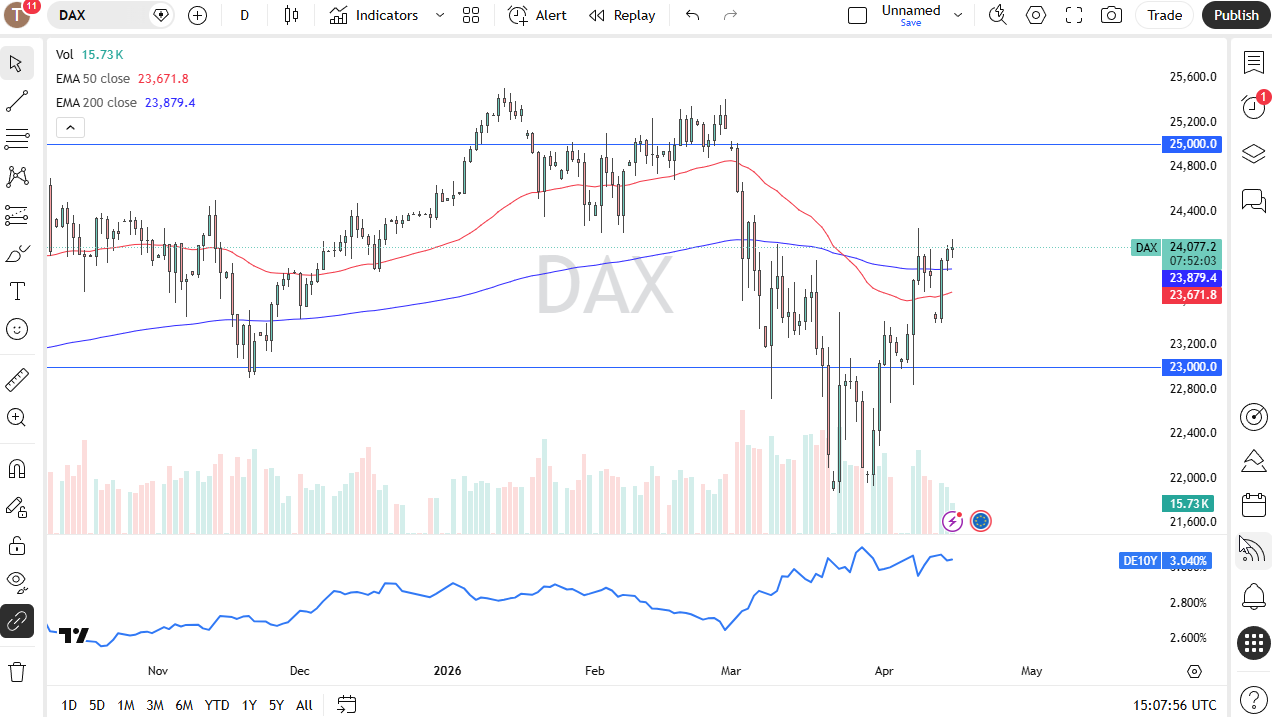 The 24,300 level is an area that's a bit of a barrier; clearing that, I think, brings more FOMO in. German 10-year yields are at about 3.04%, and I think that continues to be something to watch as well. Right around that 3% level things get a little squiggly, so keep an eye. I do think eventually the DAX finds 25,000; I just think it's going to be very noisy to get there.