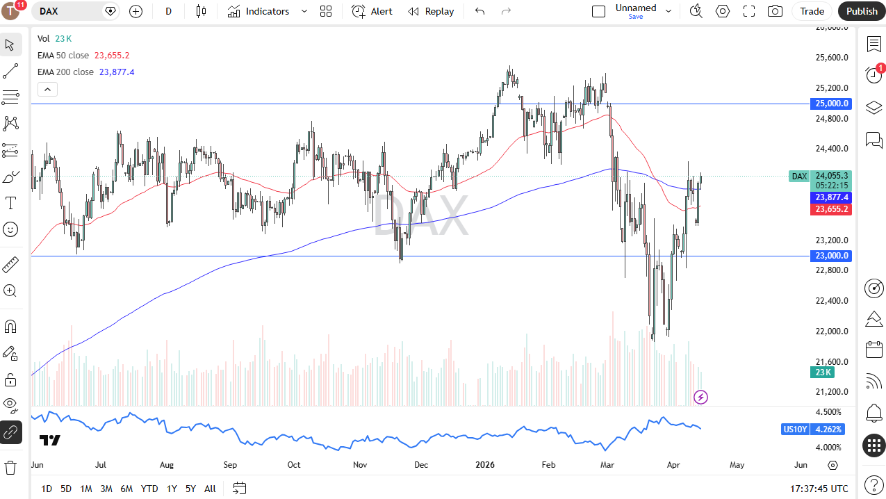 If we can break above the 24,250 level, then I think the DAX eventually finds its way back to the 25,000 level. Short-term pullbacks should be buying opportunities, unless we get some type of massive spike in interest rates in the United States and Germany or some type of headline that rattles the markets, which let's face it, could happen very easily in either the Middle East or talk about more tariffs from the.