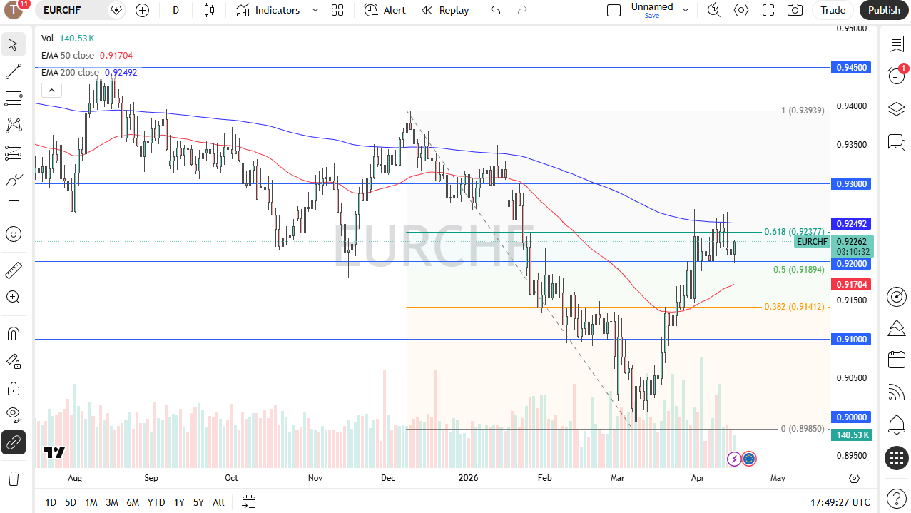 The 200-day EMA currently sits at the 0.9242 level and breaking that of course would be a pretty big victory for those who are bullish. We will just have to wait and see how this plays out, but I do think we are in a scenario where traders will continue to watch the bond markets more than anything else as they seem to be driving everything.
