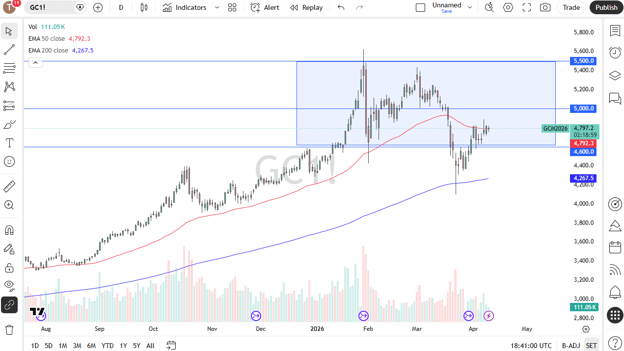 Gold markets have been very choppy during trading on Friday, which is not a huge surprise considering that this weekend will feature the ceasefire talks between the Iranians and the Americans and the bond market certainly is paying close attention which, of course, has a major and outsized influence on the gold market. The 50-day EMA sitting right here also has a part to play, so I would watch that. The market is likely to hang around the $4800 level as we try to close out the week.