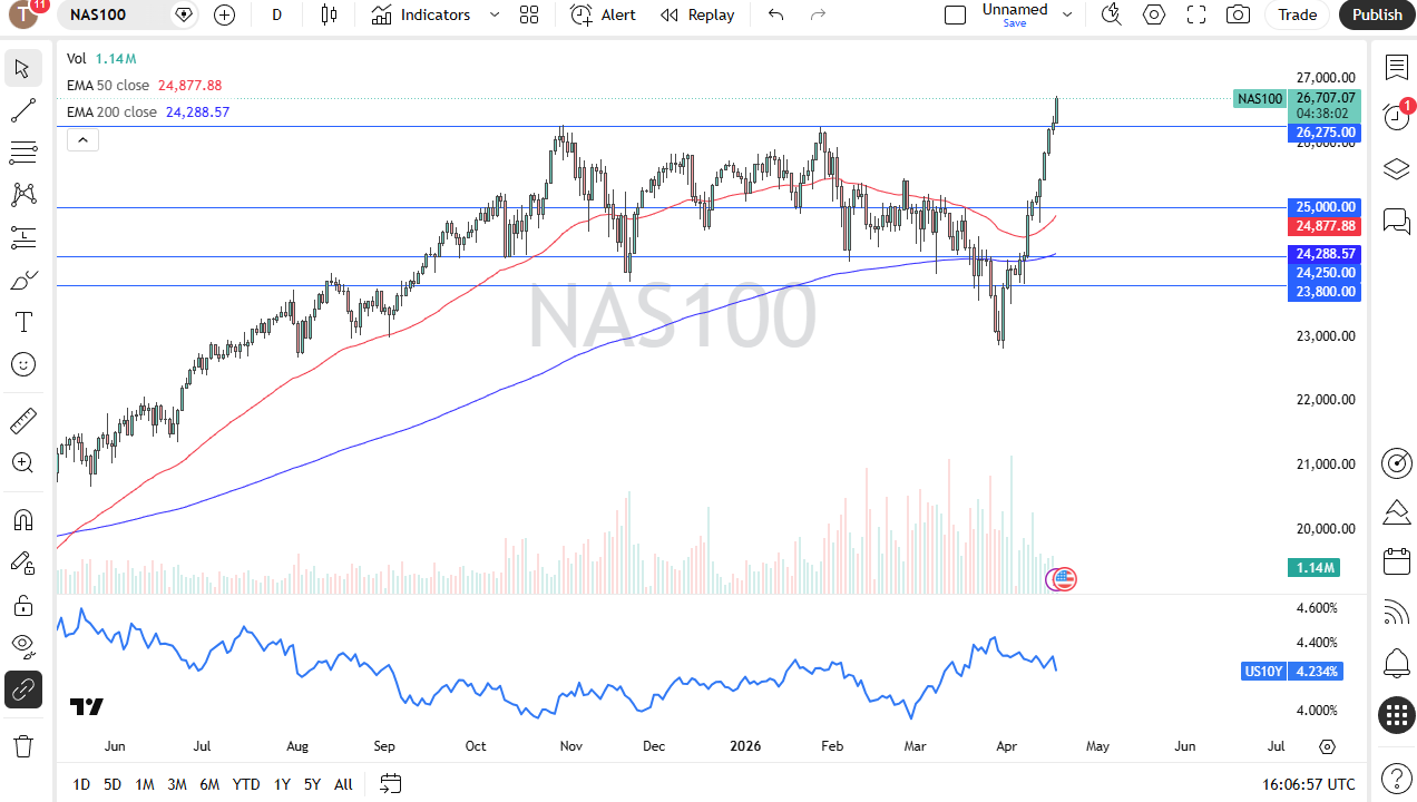 While I am very positive on the NASDAQ 100, I am a little bit leery about getting overly extended here. I think a pullback to the 26,275 level could be very interesting because it was the previous high, so the question of course is, will that offer support? The other scenario is sideways action because quite frankly to chase it here is just being reckless.