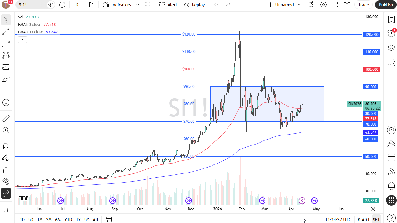 Silver continues to be very noisy as we hang around the $80 level, an area that of course has been important for some time and I think this is probably going to be the battlefield if you will in the short term as I believe traders continue to look at this market as one that will be driven by interest rates in the United States and whether or not they are rising or falling.