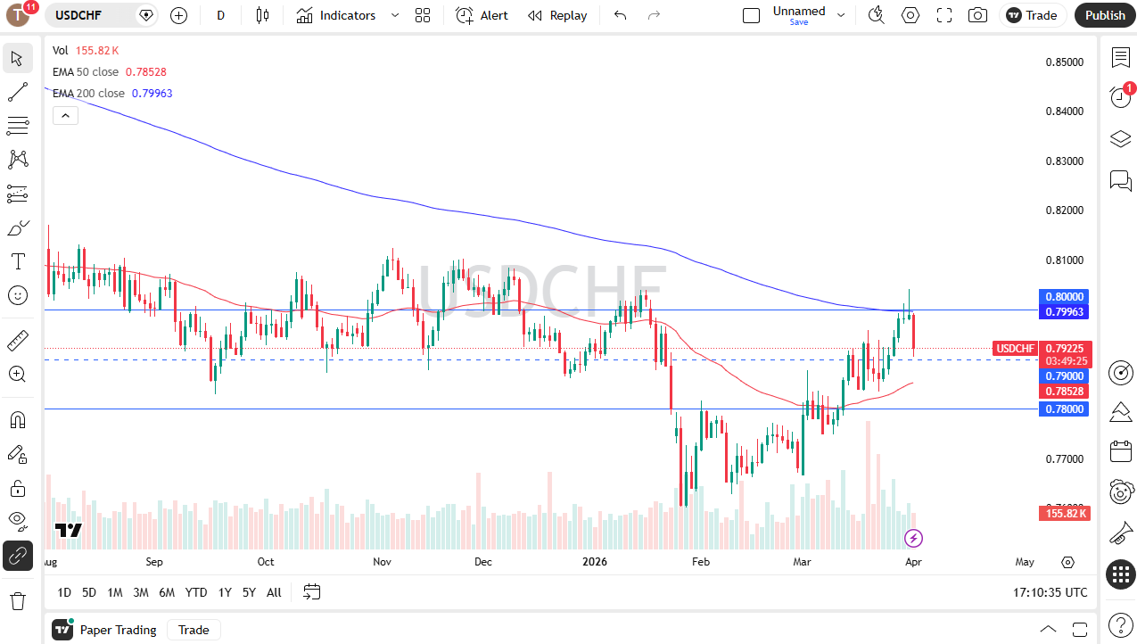 The 200-day EMA offered resistance at the crucial 0.80 level. That's a technical barrier that I think you have to keep in mind, but if we can break above the high of the Tuesday session, that would be a very strong positive sign for the dollar. To the downside, the 50-day EMA and the 0.78 are your next couple of support levels.