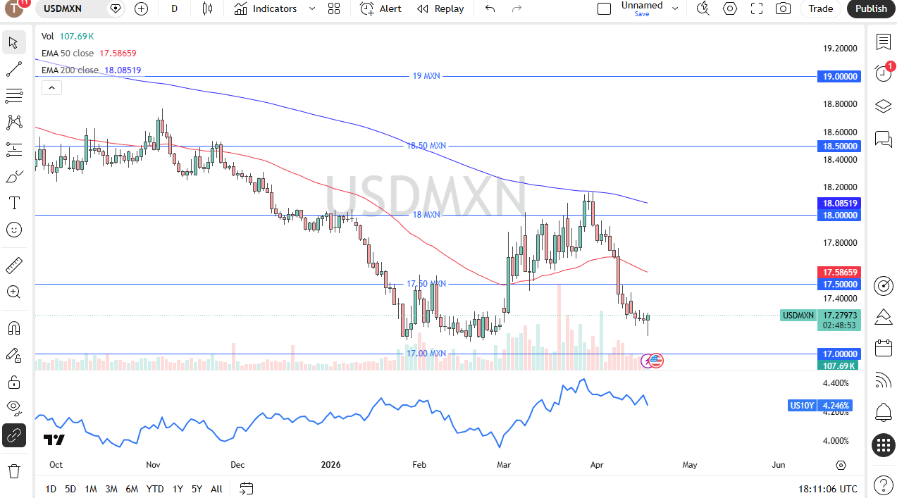 The hammer, of course, is a bullish sign, and if we can bounce from here, and I think we will, there are plenty of areas above that I would be interested in getting involved to the short side. After all, the interest rate differential favors Mexico, and that will continue to be the case, but that doesn't mean that the market needs to go in one direction forever.