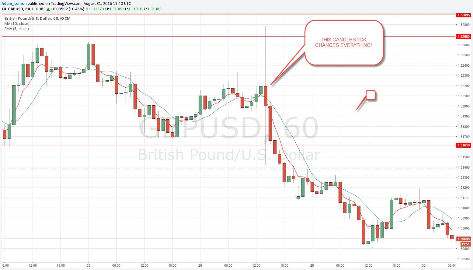 A good example is shown in the chart below. Suddenly, there was a huge, bearish, doji-style candlestick, which broke up the chart pattern and started a new market condition:
