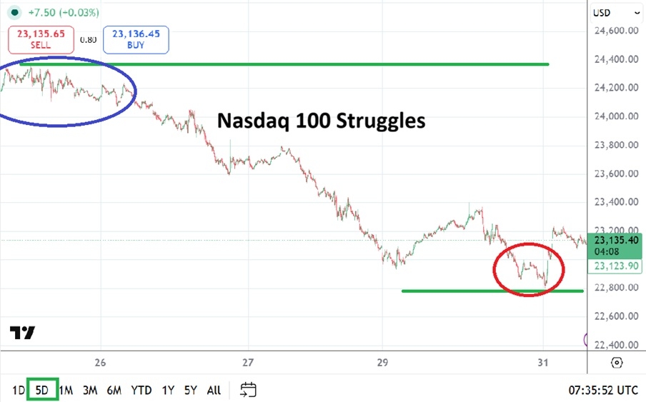 The ability to puncture the 23,000.00 level lower yesterday was important. And now the level will be looked upon as a near-term psychological marker. The broad markets remain nervous because the outlook for the Iranian war remains murky as the U.S White House has created confusion regarding its goals. Nervousness in equity markets has translated into investors seeking safe havens such as U.S bonds for the moment.